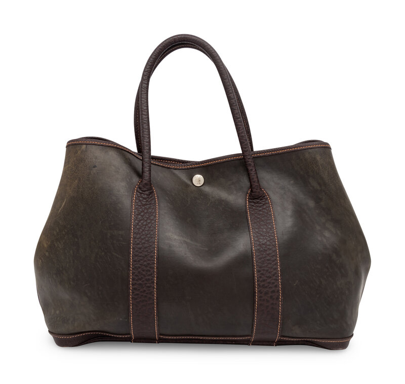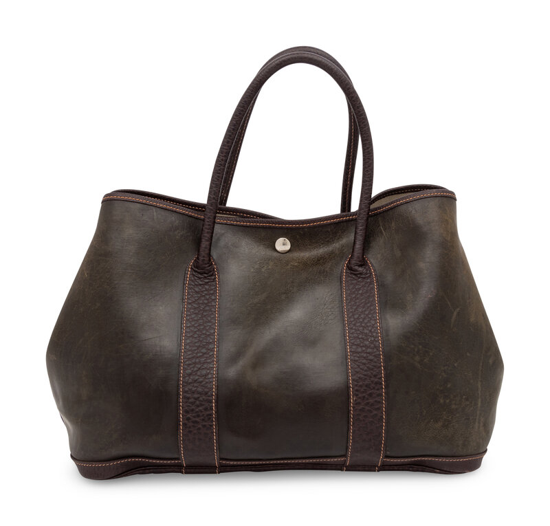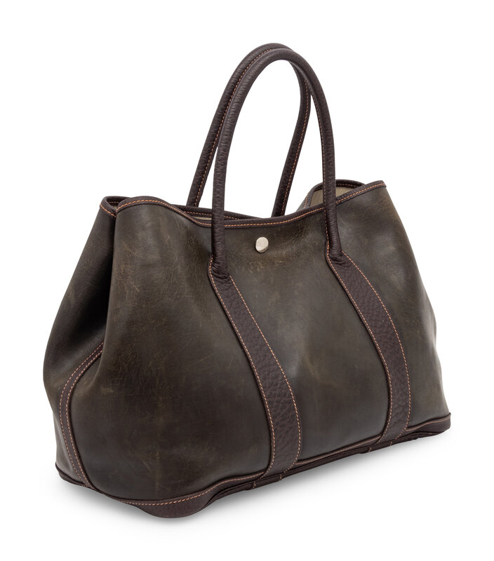 Dark green and brown leather open top tote with snaps at the side and center snap closure that reads "Hermès Paris".