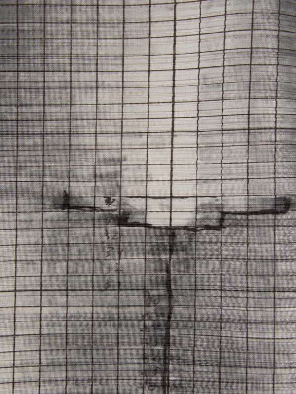 Oversized tunic in silver metallic and printed plissé polyester; featuring a print by the artist Tim Hawkinson. Wide bateau neckline; extra long sleeves. High stretch content. Unlined.