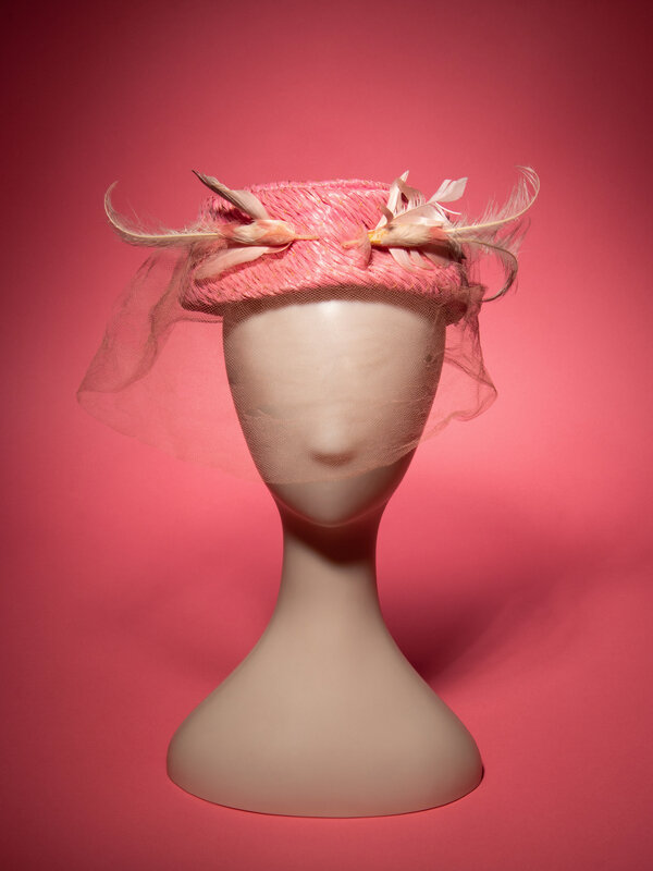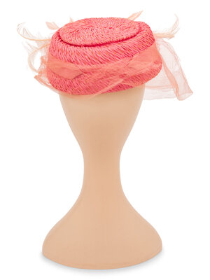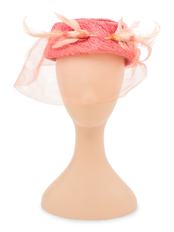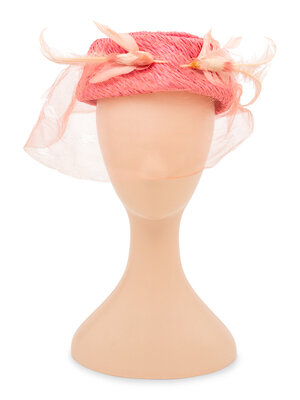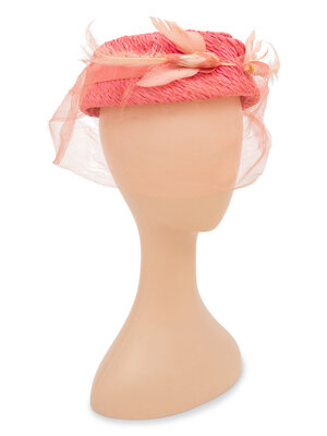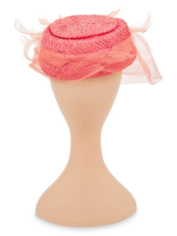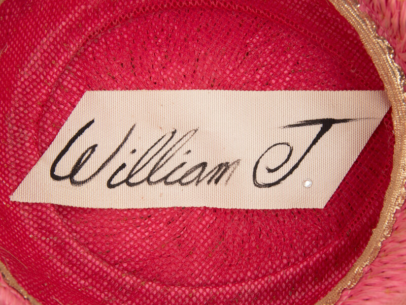 Pillbox hat in woven pink raffia; features pink petersham ribbon trim with pink veiling & pink feathers. Lined in pink stiff crinoline with gold braid trim around interior brim. Features oversized petersham ribbon label with 'William J." signature. With a faux pearl-tipped hat pin.