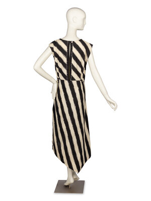 Sleeveless shift dress in black and white striped cotton ikat. Round collarless neckline. Open slit at back with button & tab closure at back neckline. Asymmetric hemline. Unlined.