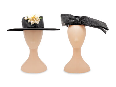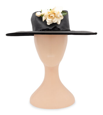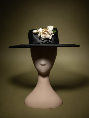 Flat-brim perching boater hat in black woven straw. Black silk velvet ribbon around the crown and a faux gardenia flower at the front of the crown of the hat. The underside of the brim is lined in black silk velvet that extends around the outer edge of the brim. Two combs at interior brim with a long loop of hat elastic, to be worn around the back of the head or under the chin.
