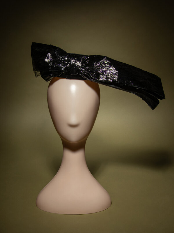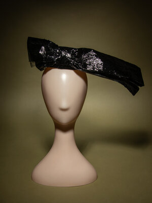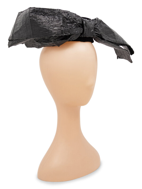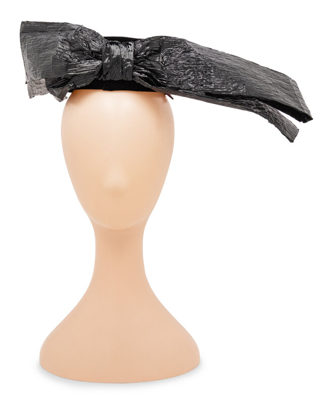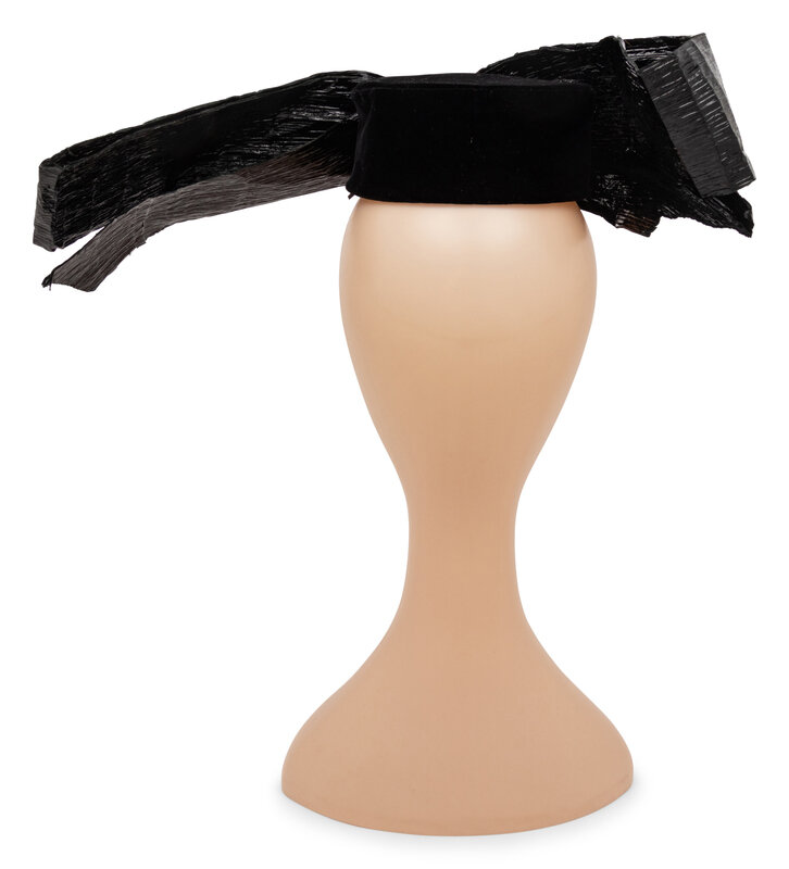 Pillbox hat in black silk velvet with large coated ribbon bow attached at the front of the hat. Lined in white stiffened sinamay. Two combs attached at interior brim with hat elastic.