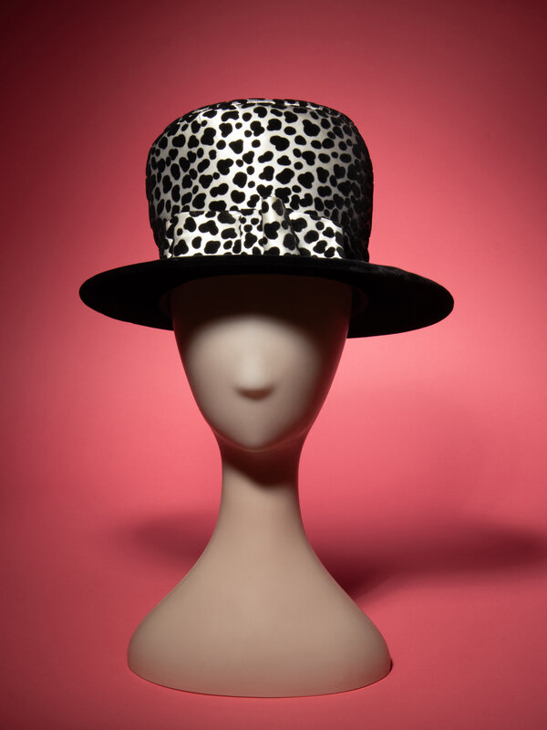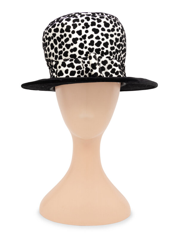 Top hat in white satin with flocked black dots throughout. Brim in black silk velvet. Lined in black silk satin with a petersham ribbon at the interior brim.