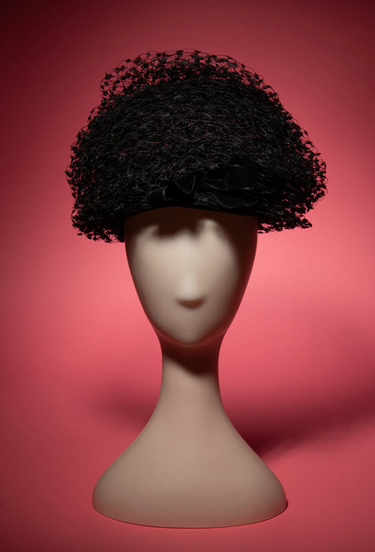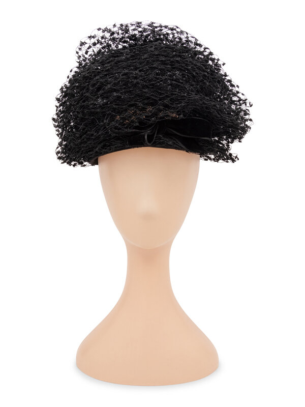 Domed hat in black stiffened crinoline with oversized black Russian netting and black velvet bows at the front and the back. Brim in black jersey with a petersham ribbon at the interior. Unlined.