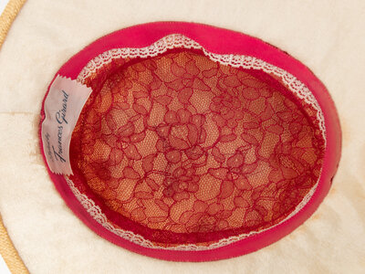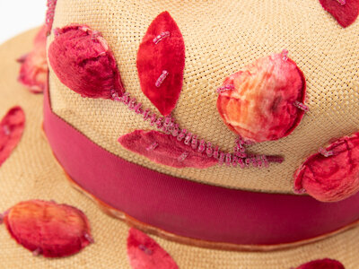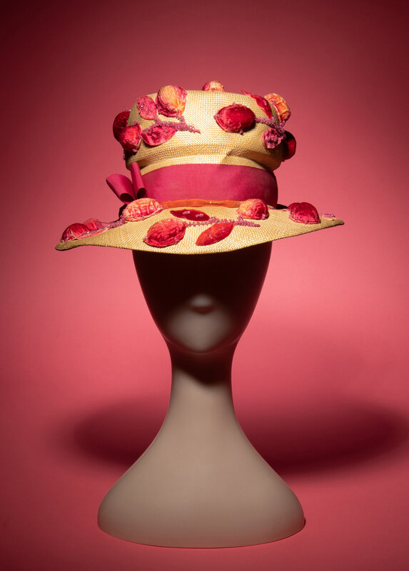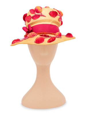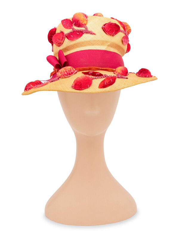 Straw hat with floral motif embellishments throughout; embellishments comprised of flocked pink faux leaves, walnut shells, and and beads. Pink petersham and orange velvet ribbons around the exterior crown of the hat. Brim underside lined in ecru satin; pink petersham ribbon & lace trim at the interior brim. Lined in pink lace.