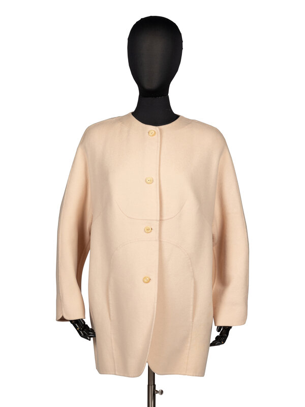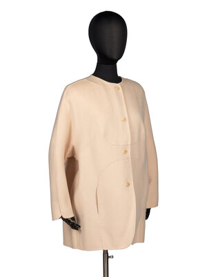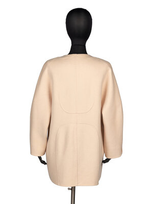 Car coat in pale pink double faced cashmere. Collarless round neckline and incorporated wrist length kimono sleeves. Light padding at shoulders. Two in-seam pockets at front. Button closures at front. Unlined.