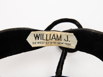 Open frame visor hat in black linen with black Russian veiling. Lined in black silk velvet. Chenille straw curlicue at back of hat. Two combs attached with hat elastic at interior brim. With woven "William J. 56 W 57th St New York" label.