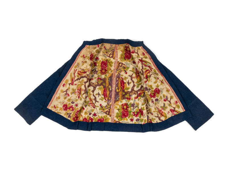 Short hip-length boxy jacket in blue wool. Small stand collar with decorative topstitching. Wrist length sleeves. Off-center button closure at front with three fabric-covered buttons & loops. Fully lined in Indian cotton in a multicolor floral print.