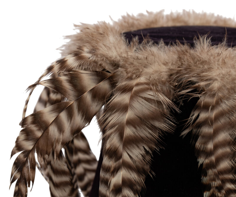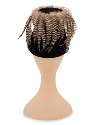 Truncated conical hat in black silk velvet, trimmed in striped brown rooster feathers. Lined in coral satin with gold braid trim around interior brim. Features oversized petersham ribbon label with 'William J." signature.