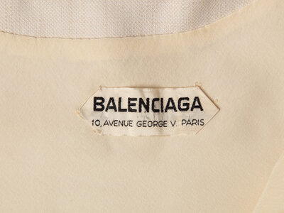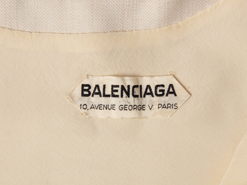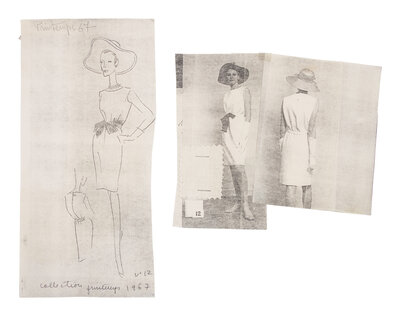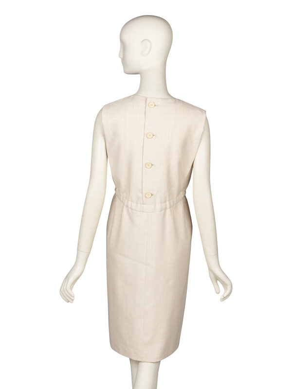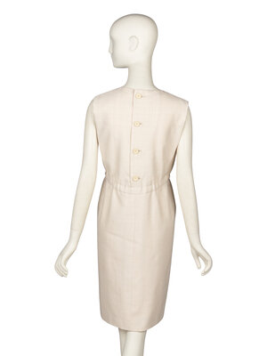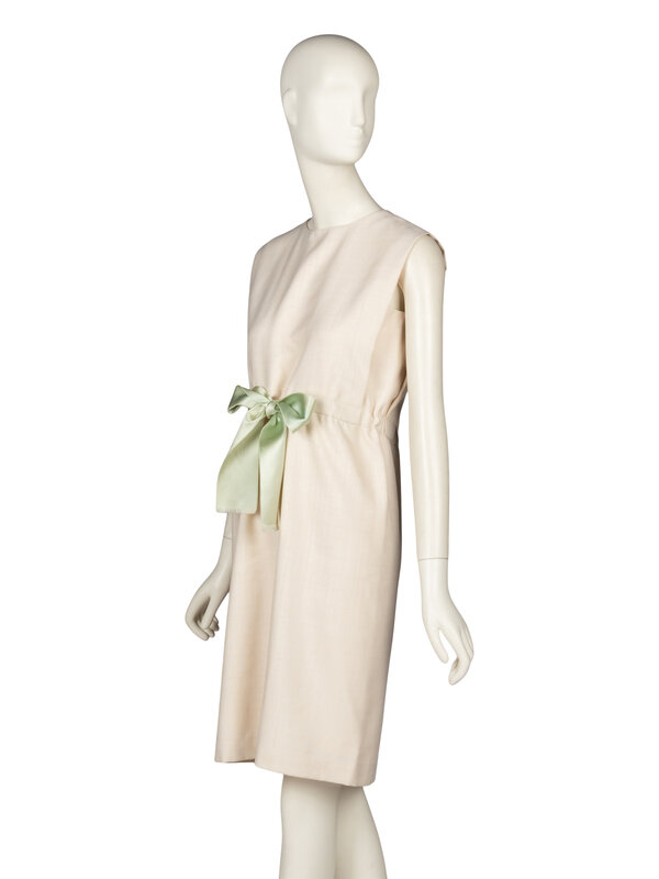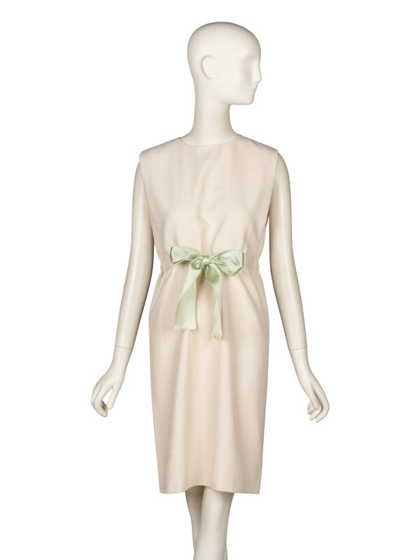 Sleeveless shift dress in ecru tropical wool with a mint green satin ribbon drawstring waist. Collarless round neckline. Knee length straight cut skirt. Button closures at back of bodice. Fully lined in ecru silk habotai.
