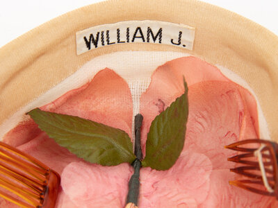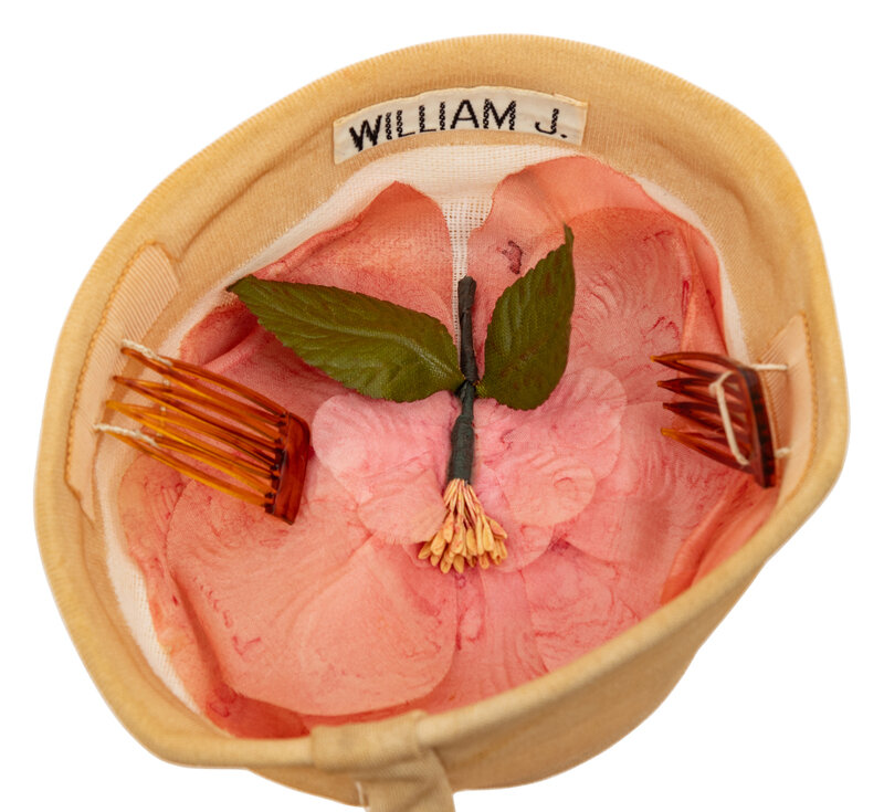 Plumed cap in stiffened ecru jersey with large multi-feather plume at front of cap. Two combs attached with hat elastic to strips of petersham ribbon at interior brim. Features faux flower 'lining' attached to interior of cap. With woven "William J." label.
