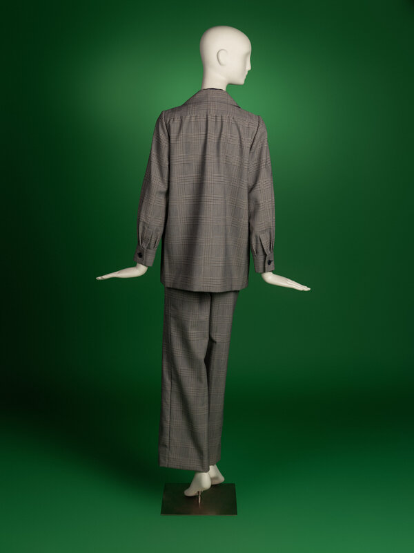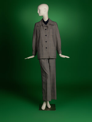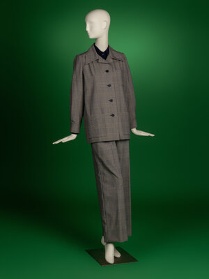 High-waisted trousers in lightweight glen check plaid wool. Two small pleats at front waist. Fly zipper and hook-and-eye closures at front. Small belt loops at waistband. Fully lined in navy blue silk habotai.