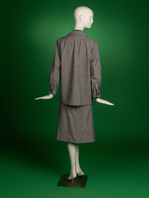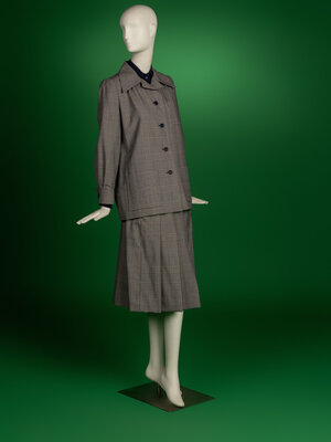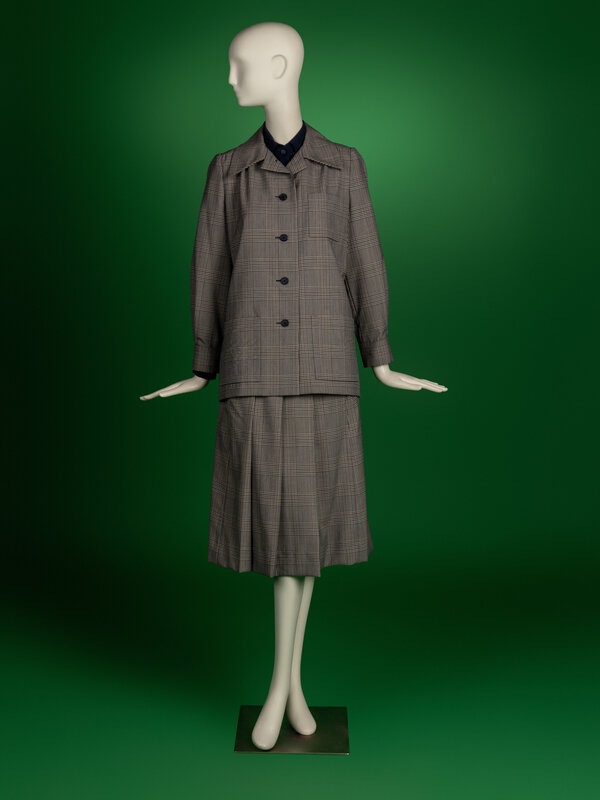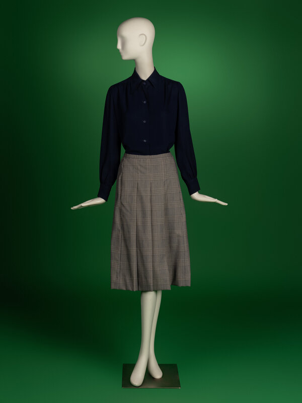 Midi length skirt in lightweight glen check plaid wool. Three large pleats at front. Two in-seam pockets at front. Zipper and hook-and-eye closures at back waist. Fully lined in navy silk habotai.