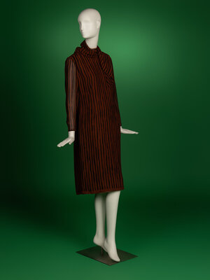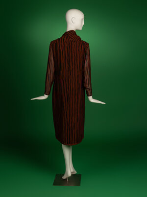 Knee length shift dress in brown silk chiffon with black stripe print. Round collarless neckline. Long semi-sheer sleeves with zipper closures at cuffs. Double-lined in brown silk organza and silk habotai. Zipper closure to exterior dress; zipper closure to lining. Comes with attachable self-fabric scarf.