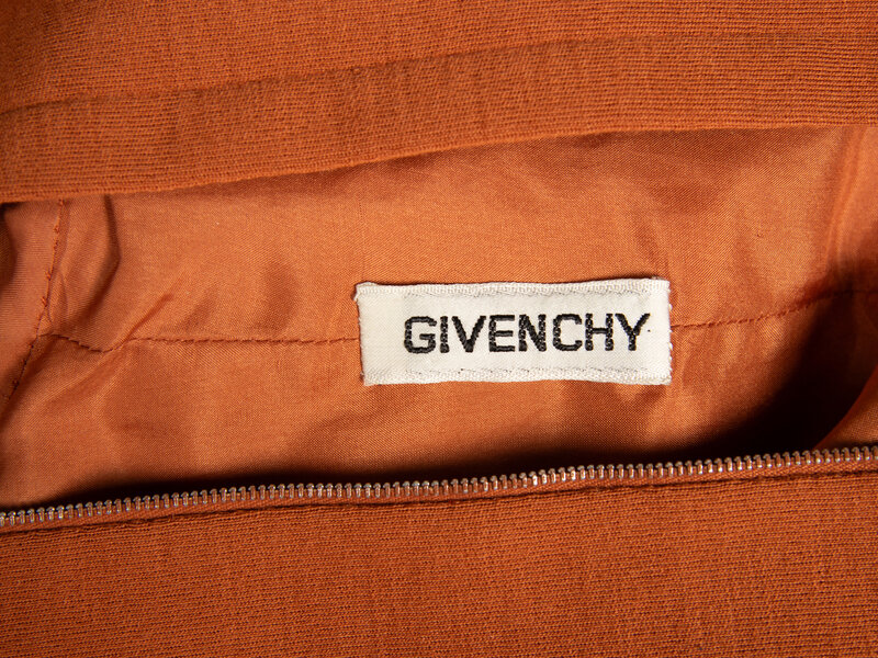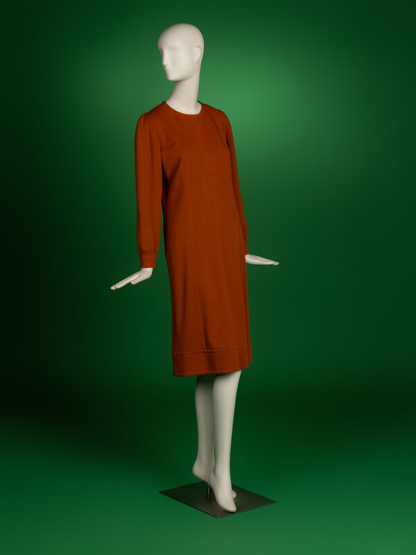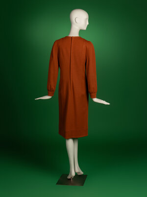 Midi length sheath dress in burnt orange wool jersey knit. Light stretch. Collarless round neckline. Long sleeves with cuffs. Decorative lapped seams with topstitching throughout. Zipper closure at back. Fully lined in orange silk.
