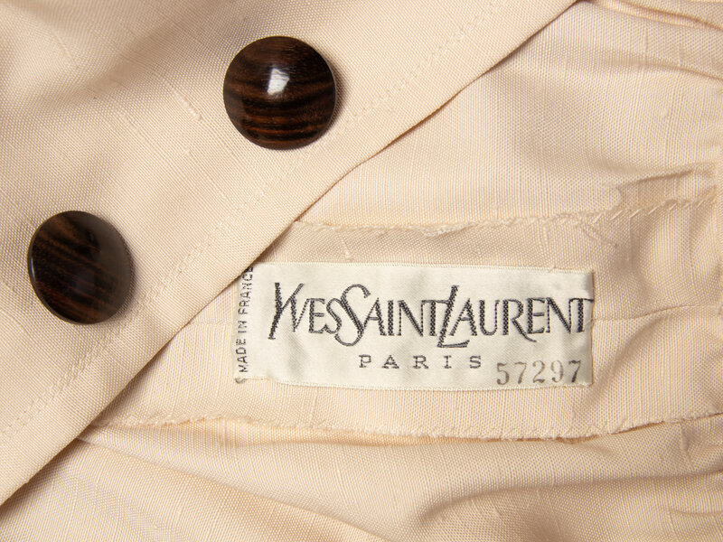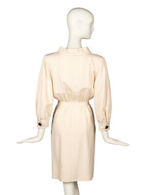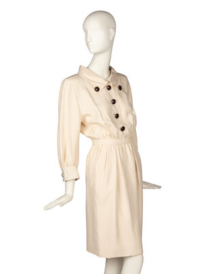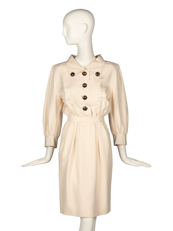 Shirtdress in cream silk dupioni. Spread collar with decorative buttons. Wrist-length sleeves with buttoned shirt cuffs. Polished wooden buttons throughout. Padding at shoulders. Knee length straight skirt with pleats at waist. Two inset pockets at hips. System of button and snap closures at front of bodice and at waist; concealed zipper and hook-and-eye closures at skirt waist side seam. Partially lined in cream silk charmeuse.