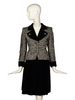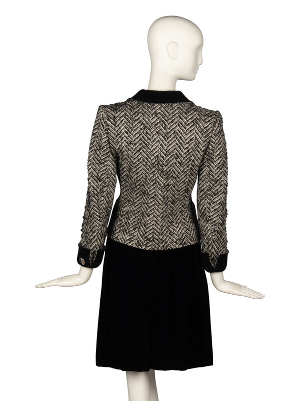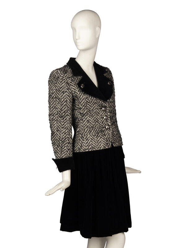 Tailored suit jacket in black & white wool herringbone tweed with black cotton velvet trim. Wide notch lapel and collar in black velvet with decorative buttoned lapels. Padding at shoulders. Full-length sleeves with black velvet notched turned-up cuffs with decorative buttons at each cuff. Two welt pockets at front. Button closures at front of jacket with large silver-tone metal and black bead buttons. Fully lined in black silk charmeuse.