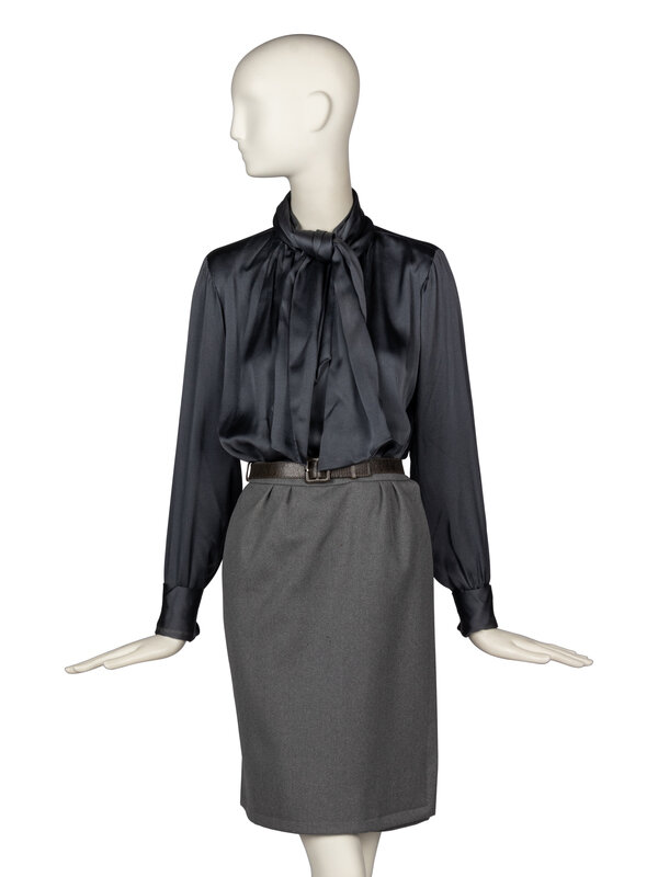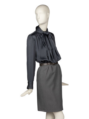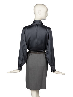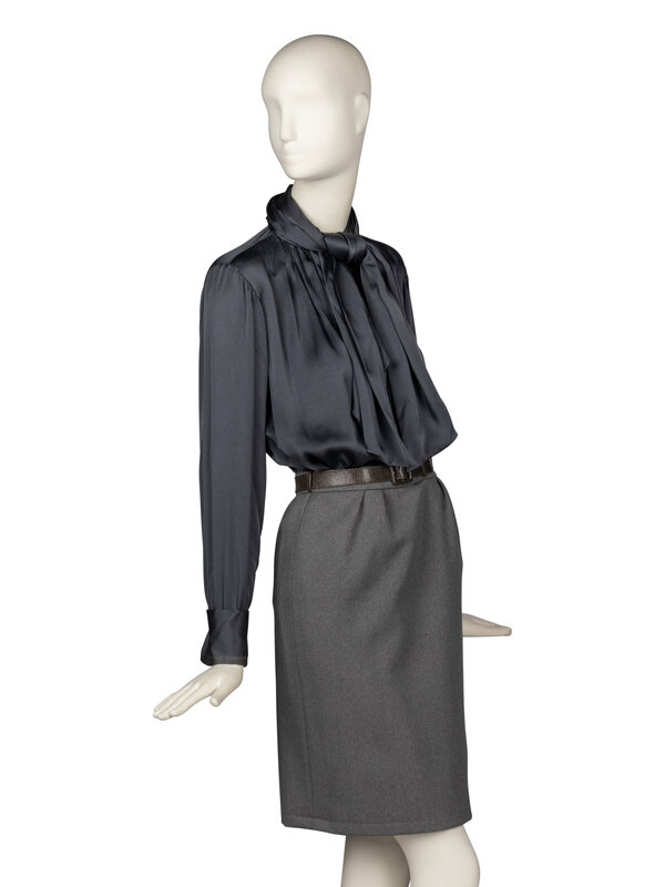 Lavallière blouse in slate grey silk charmeuse. Stand collar with attached fabric ties at neck. Light shoulder padding. Full length sleeves with French cuffs; no cufflinks. Concealed button and snap closures at front. Unlined.