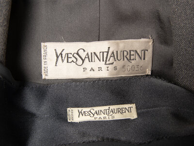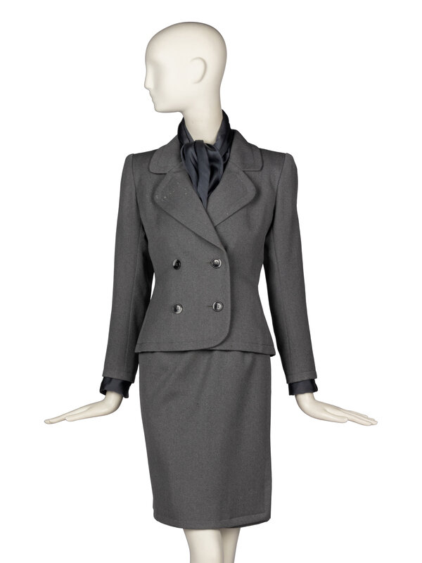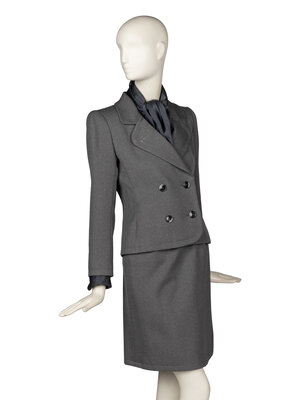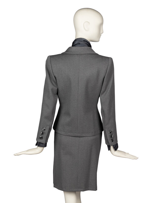 Tailored suit jacket in grey wool twill. Rounded notch lapel & collar. Double breasted button closures at front. Padding at shoulders. Surgeon's cuffs with three button closures at both cuffs. Fully lined in grey silk charmeuse.