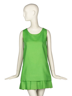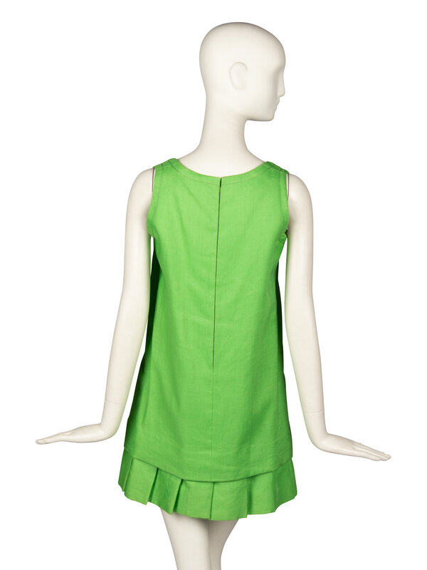 Sleeveless A-line minidress in lime green lawn fabric. Round scoop neckline. Large knife pleats at hem. Decorative topstitching at neckline and armholes. Invisible zipper closure at back. Fully lined.