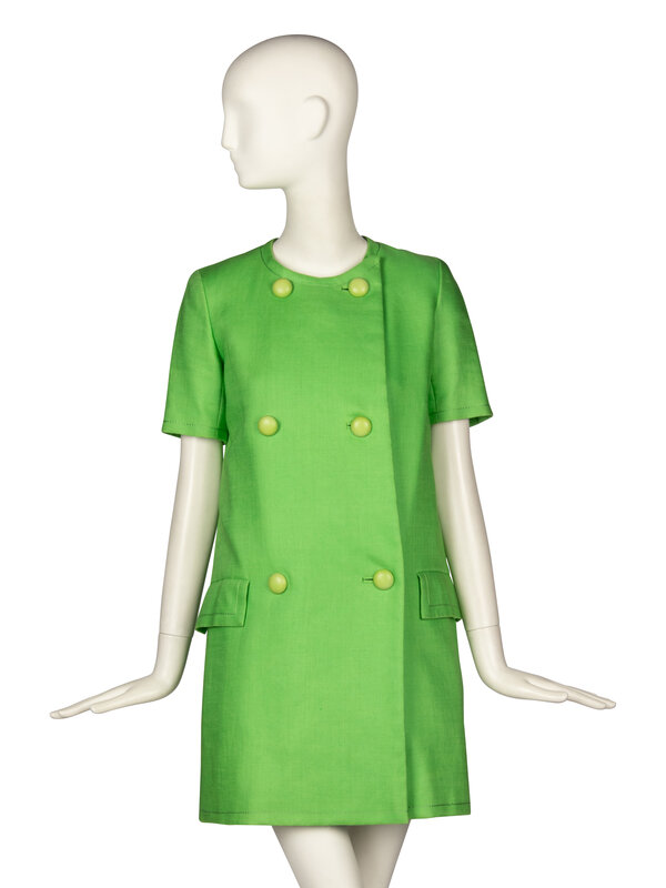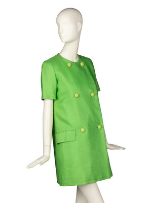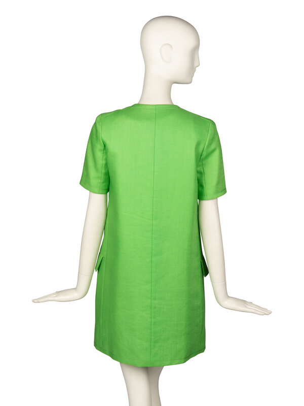 Short sleeve A-line coat/dress in lime green lawn fabric. Collarless round neckline. Double breasted closure at front with large green composite buttons and fabric-covered snaps. Two welt pockets with flaps at hips. Decorative topstitching throughout. Fully lined in green silk shantung.