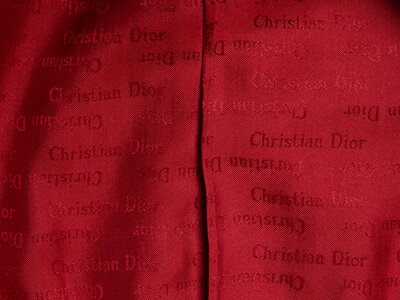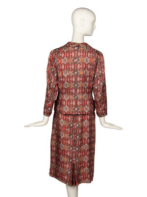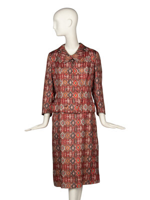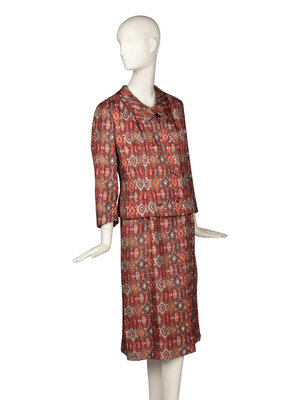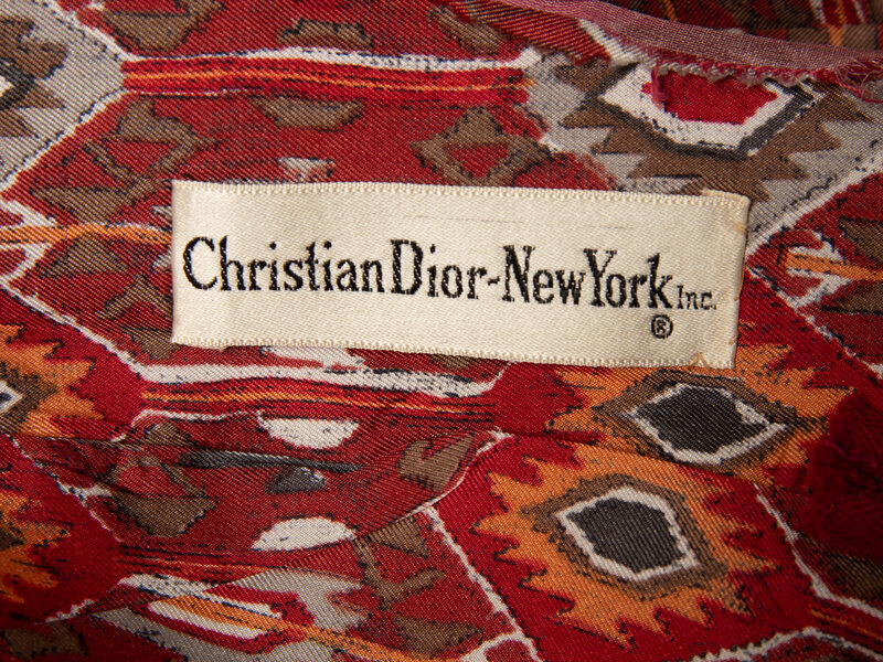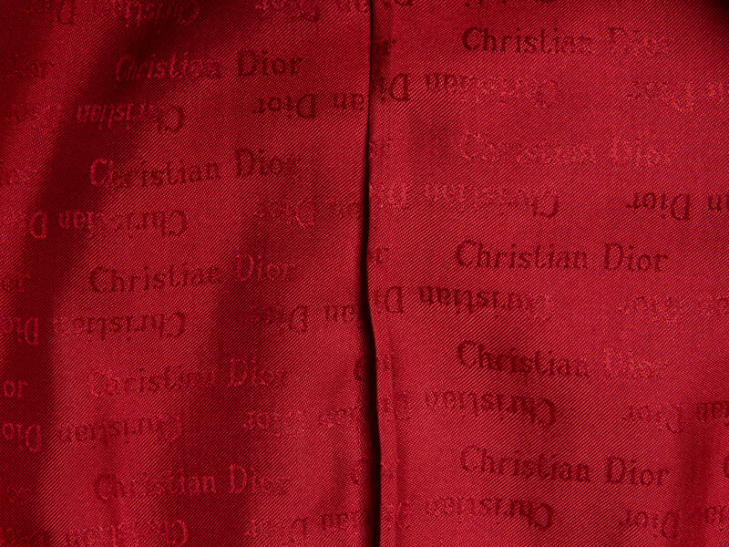 Cardigan jacket in multicolor printed silk twill. Collarless V neckline. Double breasted button closure at front with fabric-covered buttons. Wrist-length sleeves. Two small patch pockets at hem. Fully lined in crimson 'Christian Dior' silk jacquard.