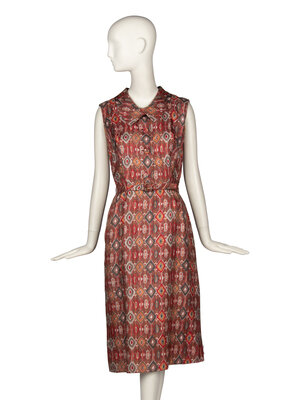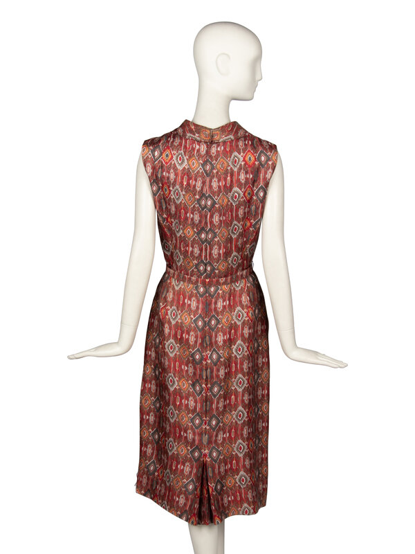 Sleeveless dress in multicolor printed silk twill. Spread collar. Button closures at front with fabric-covered buttons. Midi length skirt. Concealed zipper closure at back. Petersham waistband at interior with hook-and-eye closure. Fully lined in silk organza.