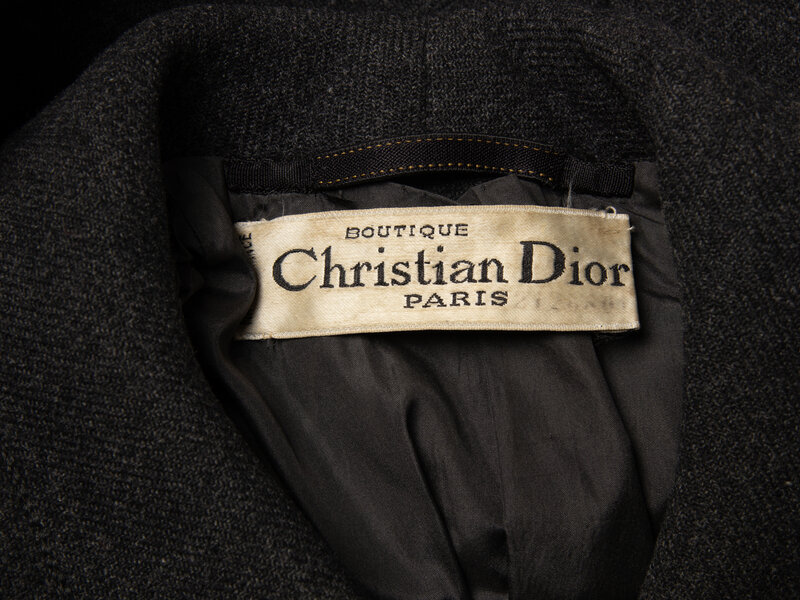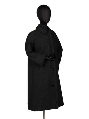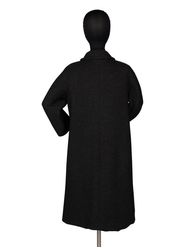Over coat in heavyweight grey wool. Spread collar. Incorporated wrist-length sleeves with underarm gussets. Two welt pockets at front. Large button closures at front. Fully lined.