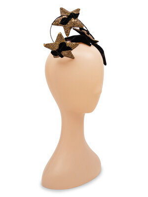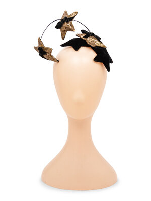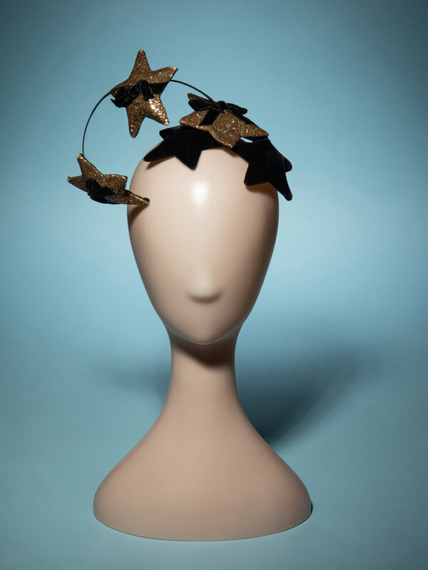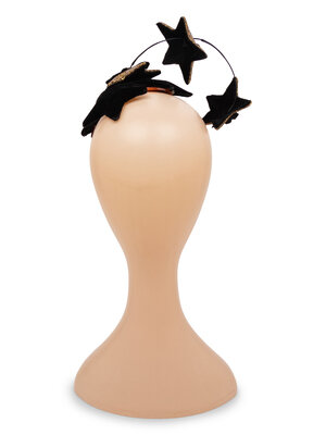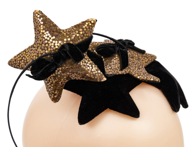 Fascinator comprised of stiffened black velvet stars and gold sequin covered stars attached to an extended wire frame. Two plastic combs attached to interior with hat elastic.