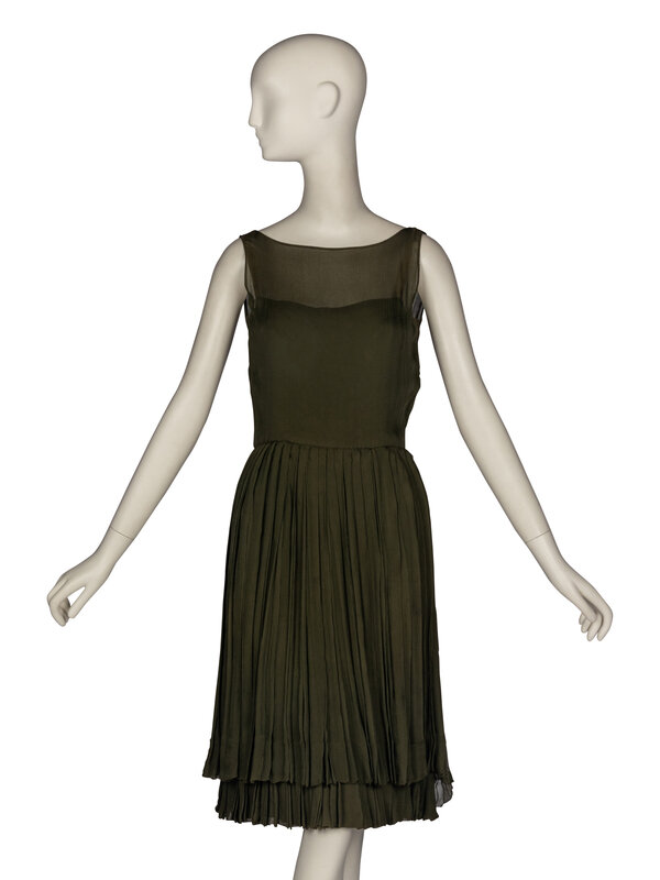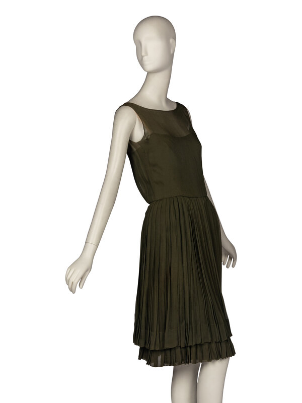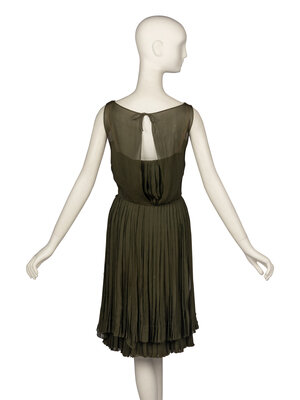 Sleeveless drop-waist dress in double-layered dark olive green silk chiffon. Pleated skirt. Inner bodice has back zip, hook-and-eye closures. Self-tie closure on outer bodice, plus an additional hook and eye at waist.