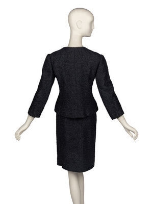 Collarless jacket in black tweed with crosshatched metallic thread. Four-button front with concealed snaps. Lined with silk. Made exclusively for the Japanese department store Daimaru.