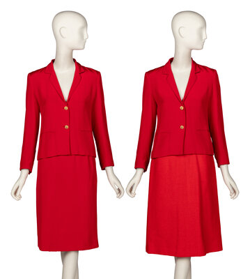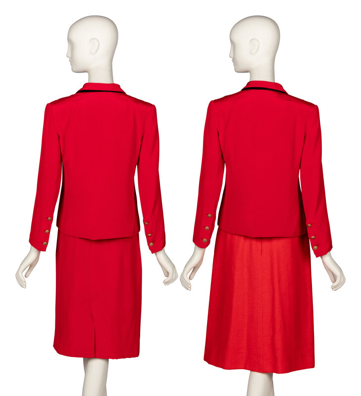Suit jacket in scarlet red crepe de chine. Notched lapels. Padding at shoulders. Wrist-length inset sleeves with three working button closures at sleeve cuffs. Two welt pockets at front. Two button closures at front; gold-tone metal lion's head buttons throughout. Fully lined in red silk habotai.