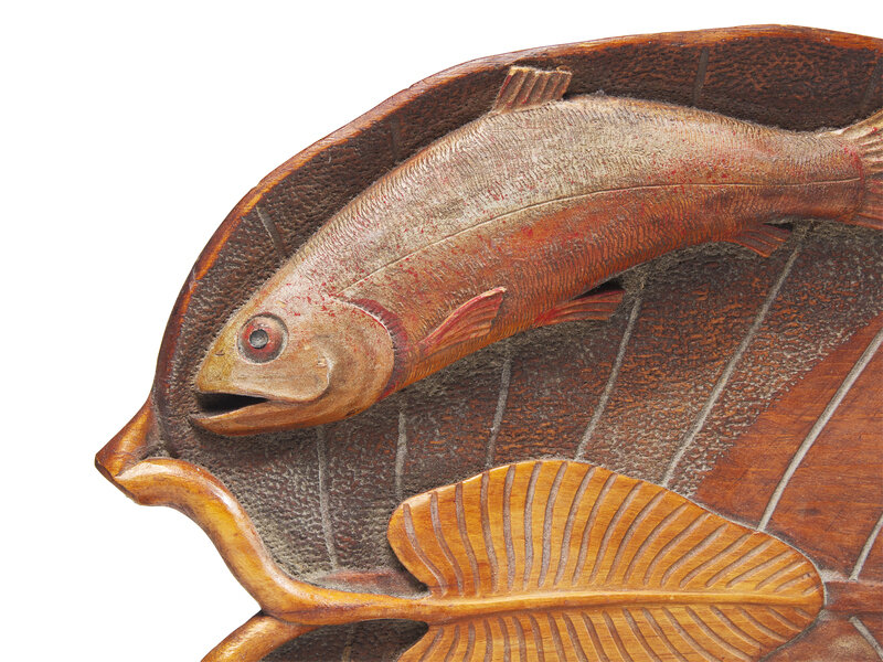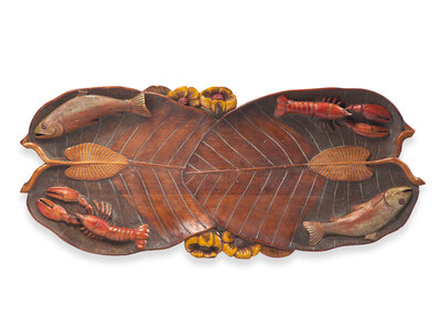 A Carved and Painted Wood Tray with Fish and Lobsters