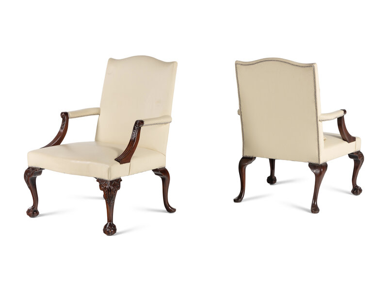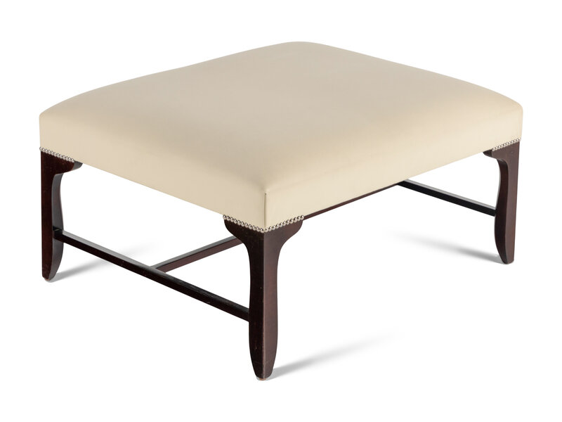 with an associated ottoman and two cushions, all in cream leather upholstery.