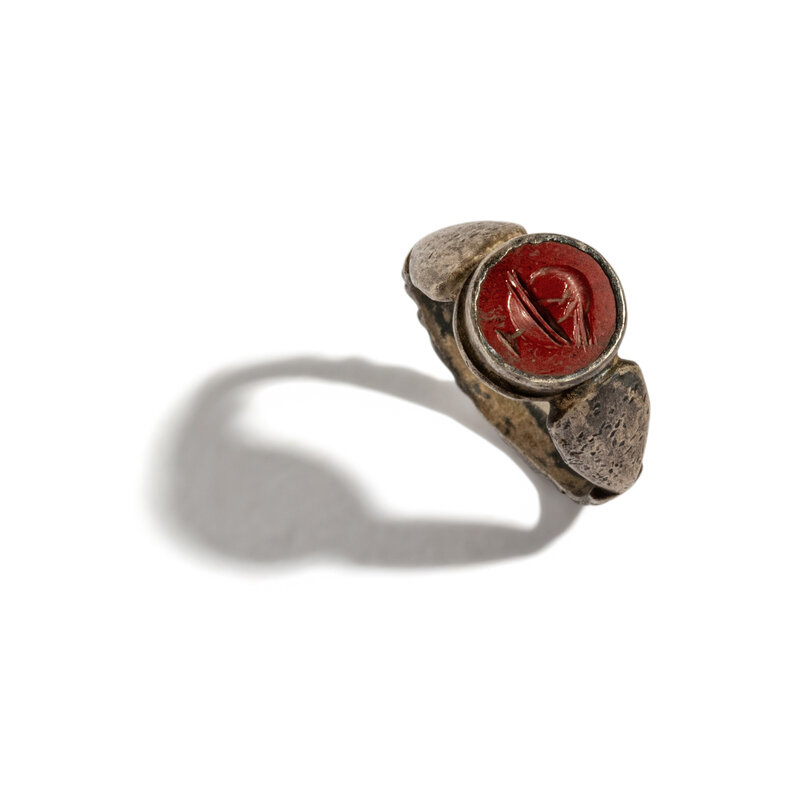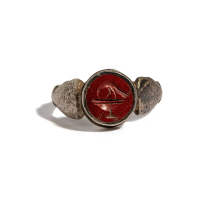 A Roman Silver and Red Jasper Finger Ring with a Bathing Bird