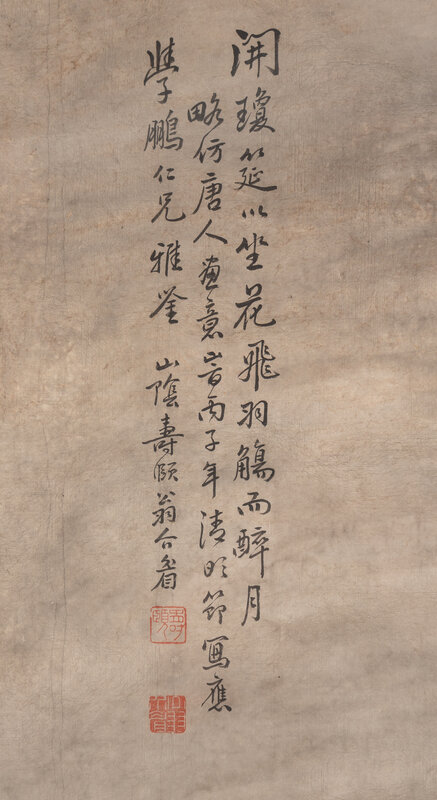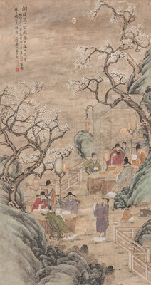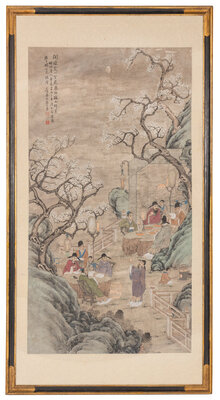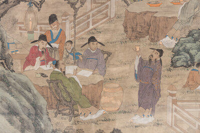 A Chinese Ink and Color on Paper Painting Depicting a Gathering Scene of Scholars