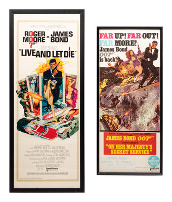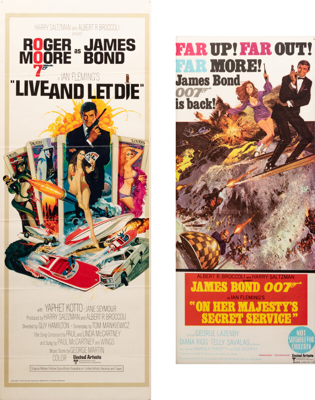 includes one insert for Live and Let Die (1973) by Roger McGinnis (36 x 14 inches). Also includes a window card for On Her Majesty's Secret Service (1969) by Frank McCarthy (22 x 14 inches).