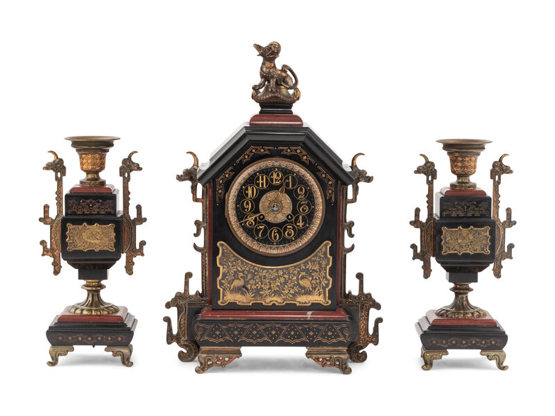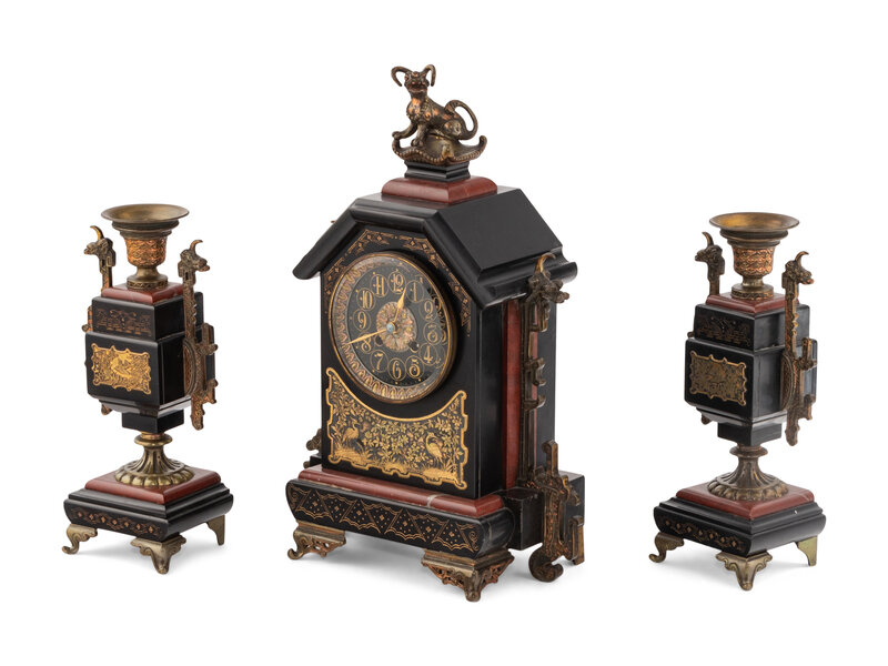 A French Gilt Bronze, Marble and Slate Clock Garniture