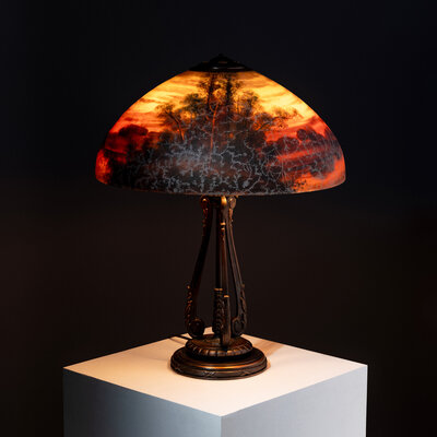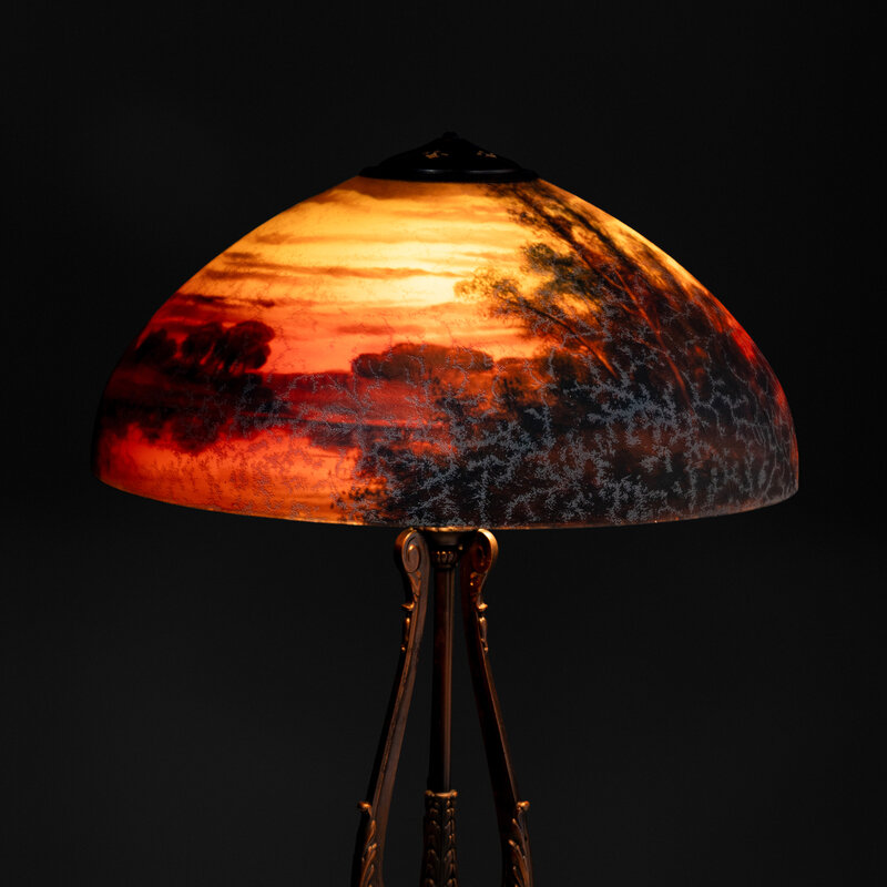 Reverse-painted glass table lamp, wooded landscape