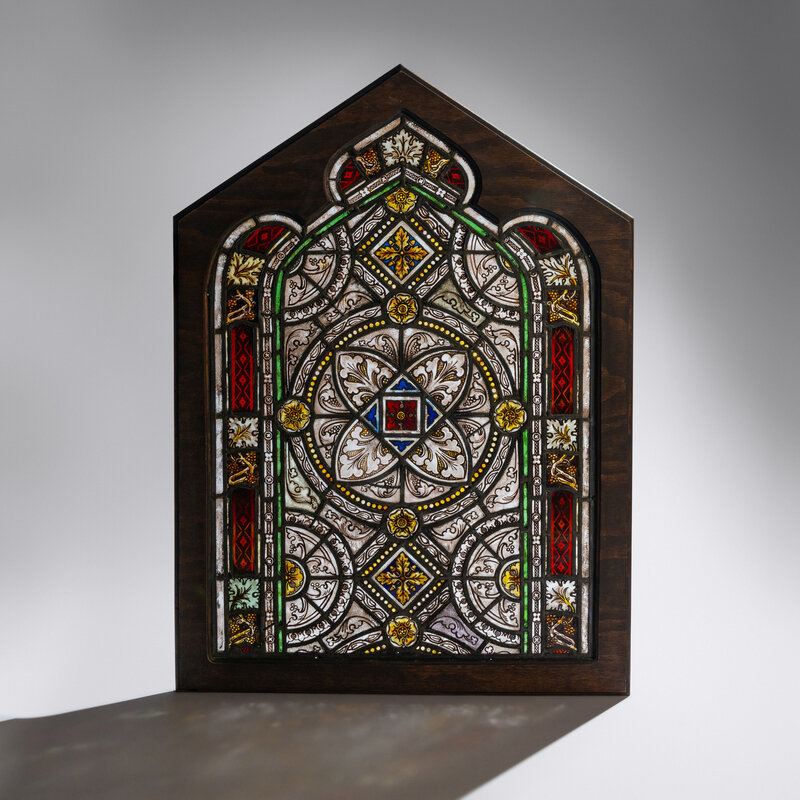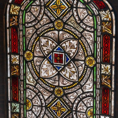 crown and shoulders, circular medallion with leaf design and small yellow Tudor roses and grapes in border