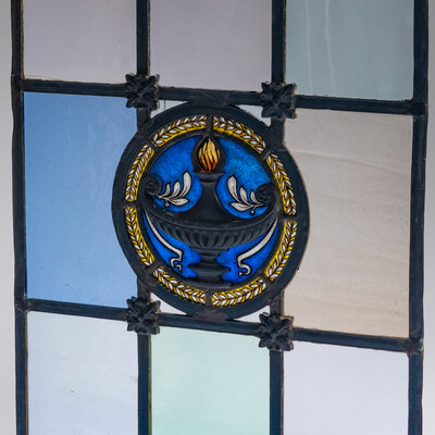 Window with cast metal lamp in circular medallion