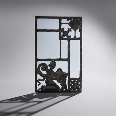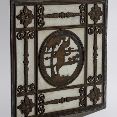 First with heavy curved lead two sides depicting a flying crane; second window depicting kneeling woman with cornucopia