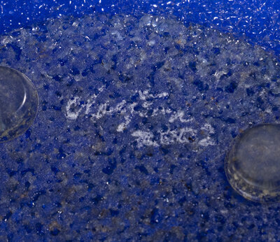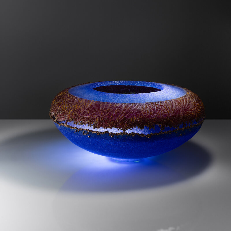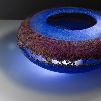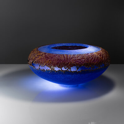 cobalt blue pate de verre vessel with red trim and electroplated open-work