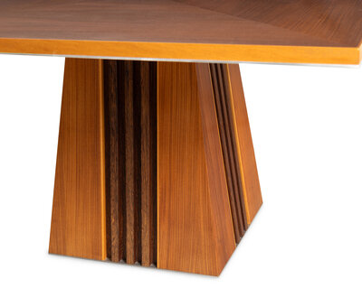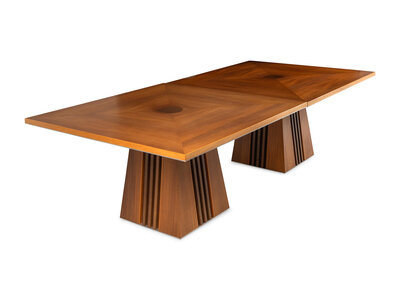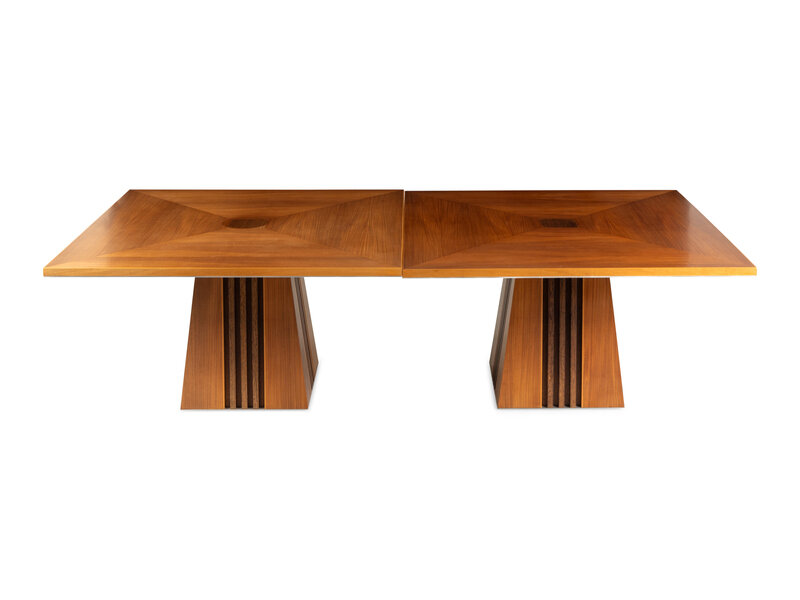 each on hidden casters for moving, with a steel locking mechanism which joins the tables together to make a long rectangular table, and two additional leaves.