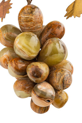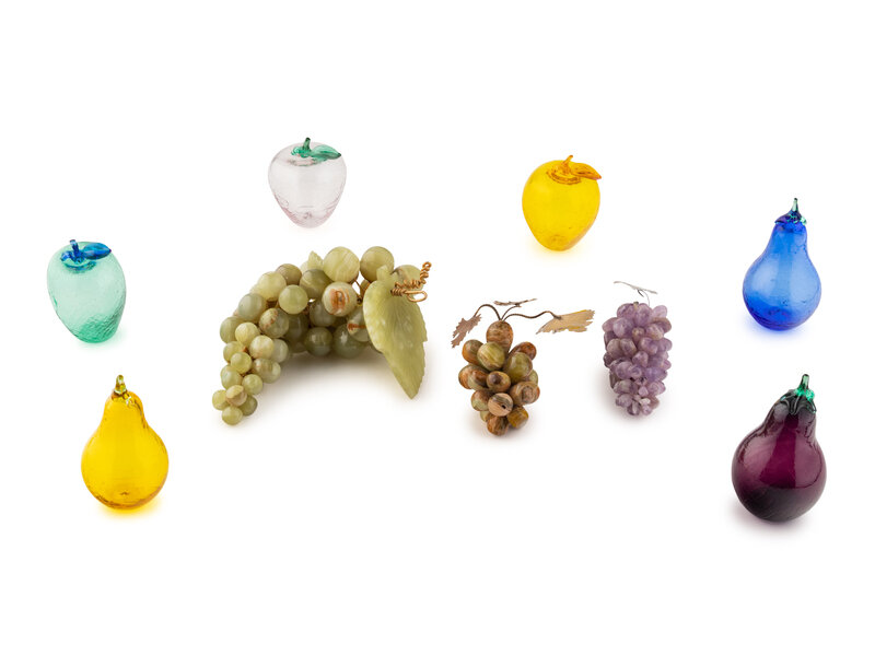 Includes six glass apples and pears and three hardstone grape clusters.