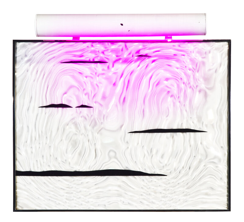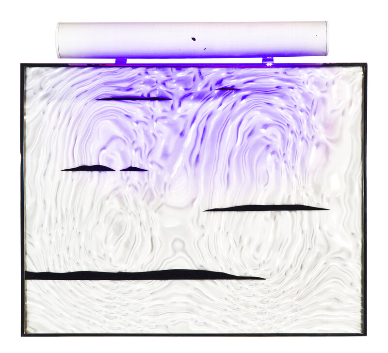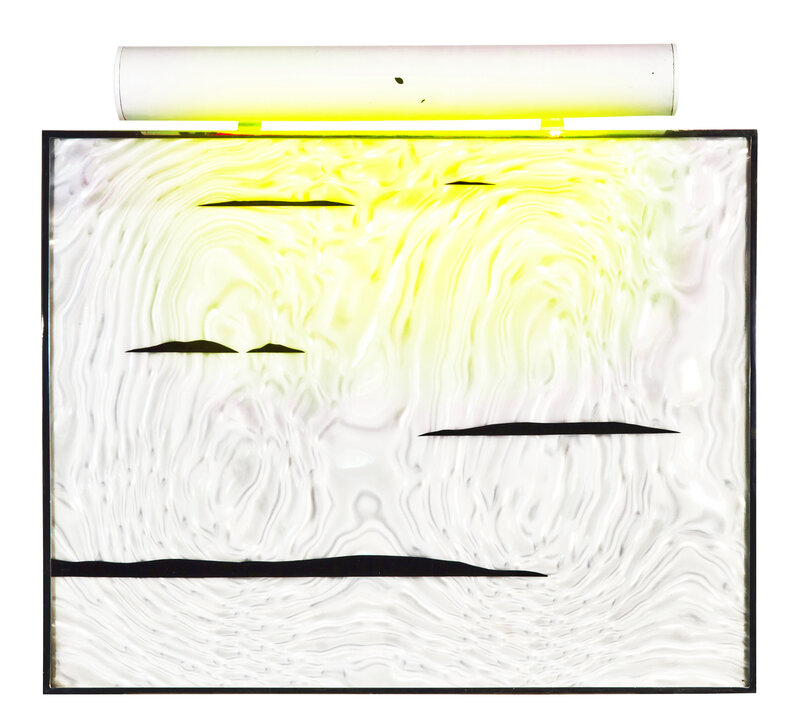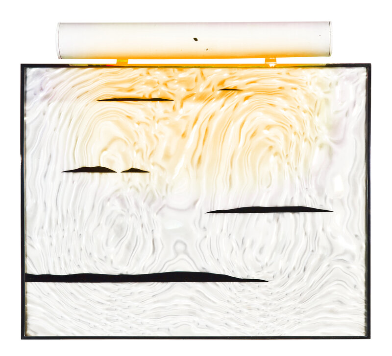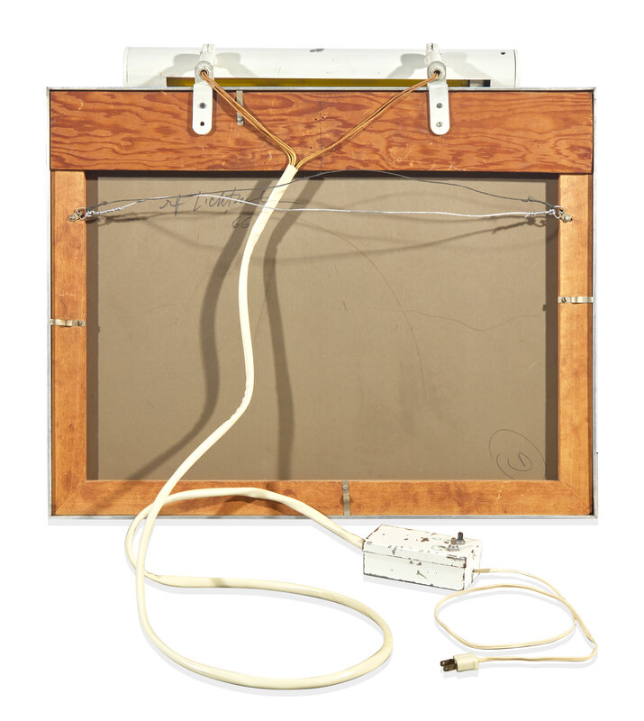 Rowlux, cut vinyl on board, welded aluminum frame, with motorized lamp surrounded by rotating, multi-colored plastic cylinder