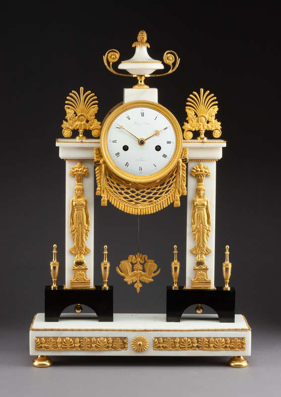 A French Neoclassical Gilt Bronze and Marble Mantel Clock Height 20 3/8 x width 13 3/8 inches.