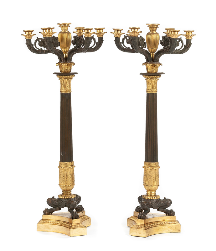 A Pair of French Gilt and Patinated Bronze Seven-Light Candelabra Height 31 1/2 inches.