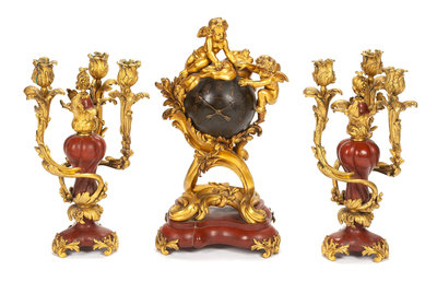 A French Gilt Bronze and Rouge Marble Clock Garniture Height of mantel clock 19 inches; height of candelabra 15 inches.
