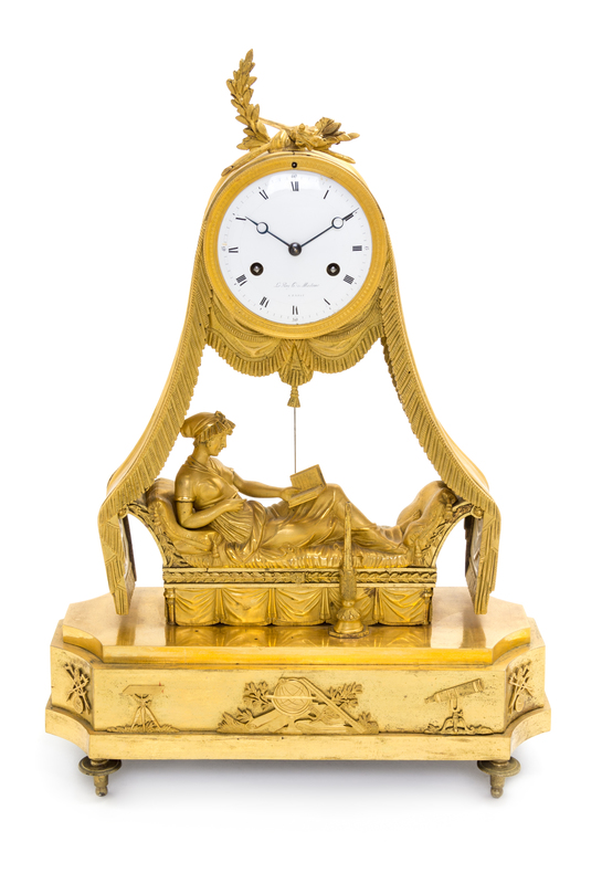 A Directoire Gilt Bronze Mantel Clock Height 20 1/2 x width 14 1/8 inches.